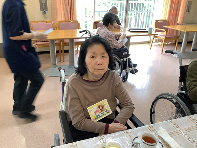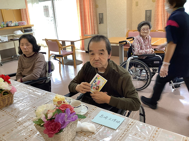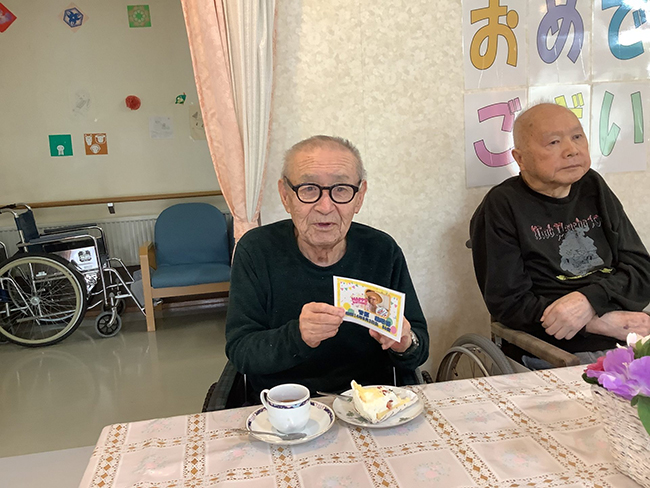 ![]() | 恒例のバースデーカードもお一人お一人にお渡ししました。 バースデーカードにはご本人の写真が載っているのですが、ご自分の写真を見て「かわいい」「いい写真だ」と嬉しそうにされていました。 | ![]() |