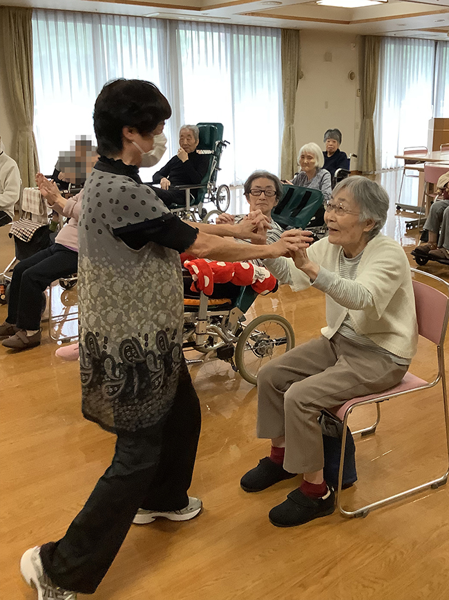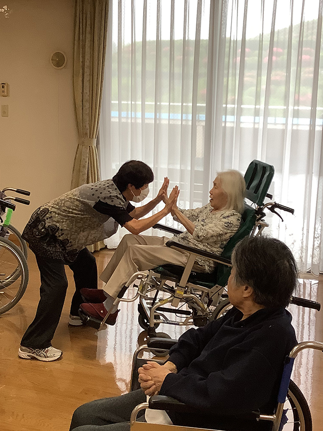 また、一人ずつ先生とハイタッチする場面では、お名前をお呼びすると、先生もびっくりするほど大きな声で返事をされている方もいらっしゃいました😊先生の動きに合わせて、皆さん楽しそうに取り組まれていました😊
