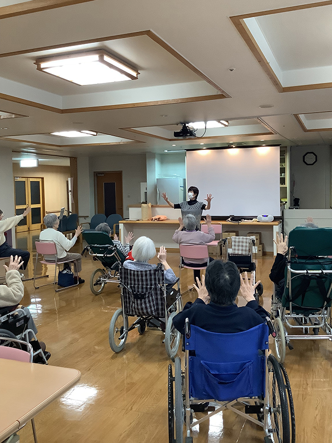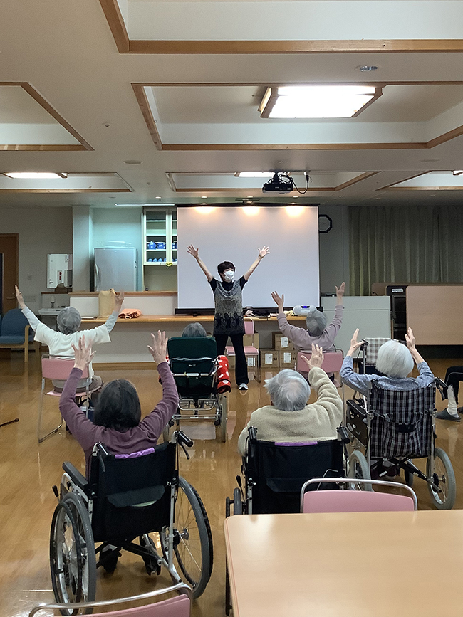 和敬園では毎週火曜日、体操教室を行っています。今回は2階のご利用者様が参加されていました。血行を良くする手足のマッサージや、座ったままできる体操でストレッチ!