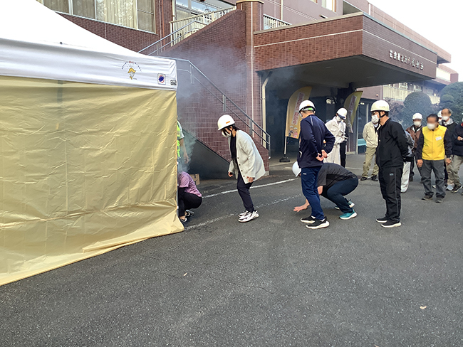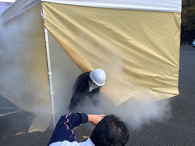 ![]() | また、火災を想定して煙の中を進む体験もしました。 | ![]() |