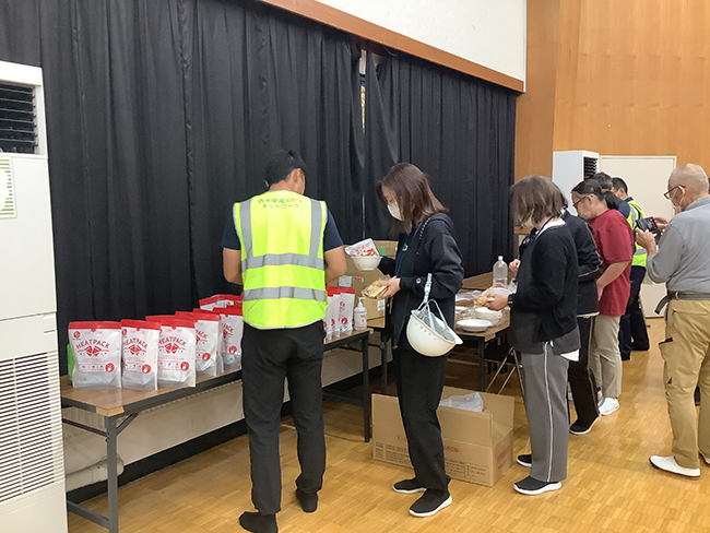 ![]() | 最後に実際にヒートパックを使って保存食を調理し、混ぜご飯や豚汁、ハンバーグを試食しました。 | ![]() |