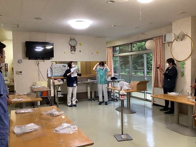 ![]() | デモンストレーションをして頂いた後、職員一人ひとり、実技訓練を行い正しいガウンテクニックを改めて確認し技術を養いました。 | ![]() |