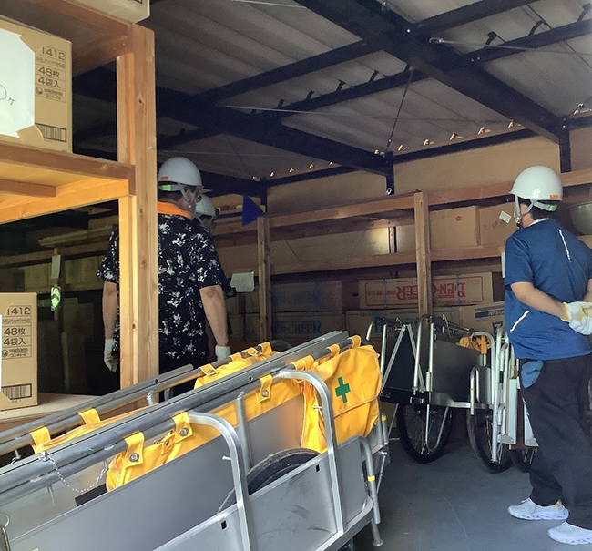 | 防災倉庫・備蓄品倉庫確認としまして、倉庫内の備蓄品を確認を行っています。「備えあれば憂いなし」という言葉もありますので、災害時スムーズに対応できるよう日々の災害訓練時に全体に周知を行っています。 | ![]() |