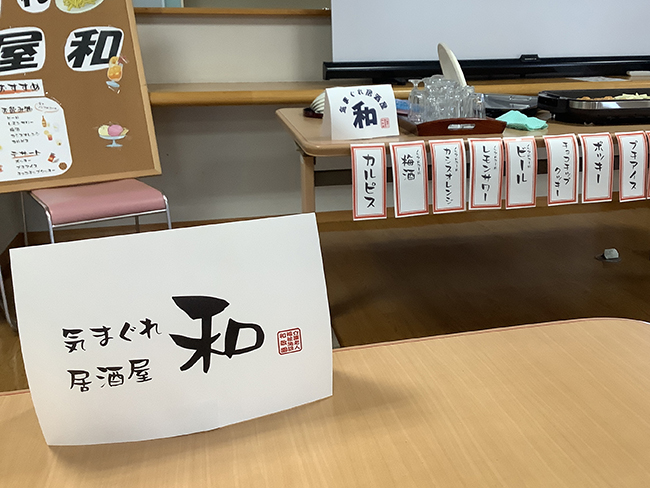 職員のアイデアからスタートした"気まぐれ居酒屋 和"は今回が2回目の開催です。ノンアルコールのお酒とおつまみを用意して乾杯しました。