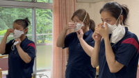 ![]() | デモンストレーションをして頂いた後、職員一人ひとり、実技訓練を行い正しいガウンテクニックを改めて確認し技術を養いました。 | ![]() |
